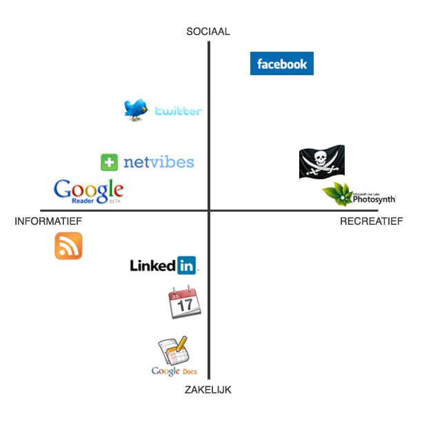Een spelletje op Facebook: sociaal en recreatief. Het delen van RSS-feeds: informatief en sociaal, misschien ook zakelijk. Twitter is misschien nog wel het beste voorbeeld. Het is met name een sociaal netwerk, zo was het ook bedoeld, maar Twitter kan ook zeer informatief zijn. Zie BreakingNews, dat de gevestigde namen vaak verslaat met het laatste nieuws. Anderen halen uit Twitter vooral veel zakelijk voordeel, dat knnen zowel contacten als informatie zijn.