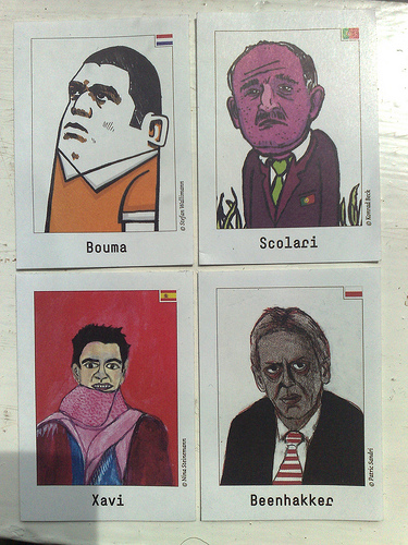 by Jerry HoutmanOok Spotprent Effect ontkomt niet aan de EK-manie die half Europa in zijn greep houdt. In een hippe Bernse bar, licht aangeschoten inmiddels, trof ik onder meer deze plaatjes aan. Duidelijk te herkennen waren de grauwe, doorrookte kop van Leo Beenhakker, het geblokte en robuuste uiterlijk van Wilfred Bouma, de ijdele Spanjaard Xavi en de Portugese bondscoach, driftkikker Scolari (ex-bondscoach eigenlijk, Portugal werd gisteren namelijk door de Duitsers uit het toernooi geknikkerd). Zijn er meer Bern-gangers die dergelijke karikaturen zijn tegengekomen?