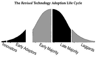 Mobiel internet heeft uiteraard de innovators bereikt anders had het nooit in de markt gestaan en ook de early adopters zijn inmiddels bekend met de mogelijkheden van mobiel internet en maken er regelmatig gebruik van. In 2008 moet de sprong gemaakt worden naar de early majority (34% van de consumenten). Deze sprong is niet zomaar een stap naar een volgende fase van de levenscyclus, maar vanaf deze stap gaat een product ook structureel geld opleveren. Er zijn hele boeken geschreven over het nemen van de sprong van de early adopters naar de early majority. Veel producten slagen er nooit in deze stap te maken. Onderstaand figuur laat dat duidelijk zien. Het gat tussen de early adopters en de early majority is de innovation graveyard. Mobile marketing en mobiel internet, waarvan het succes nauw met elkaar verbonden is, gaan in 2008 de sprong maken en zullen als geducht onderdeel van de mediamix het nieuwe jaar betreden.
