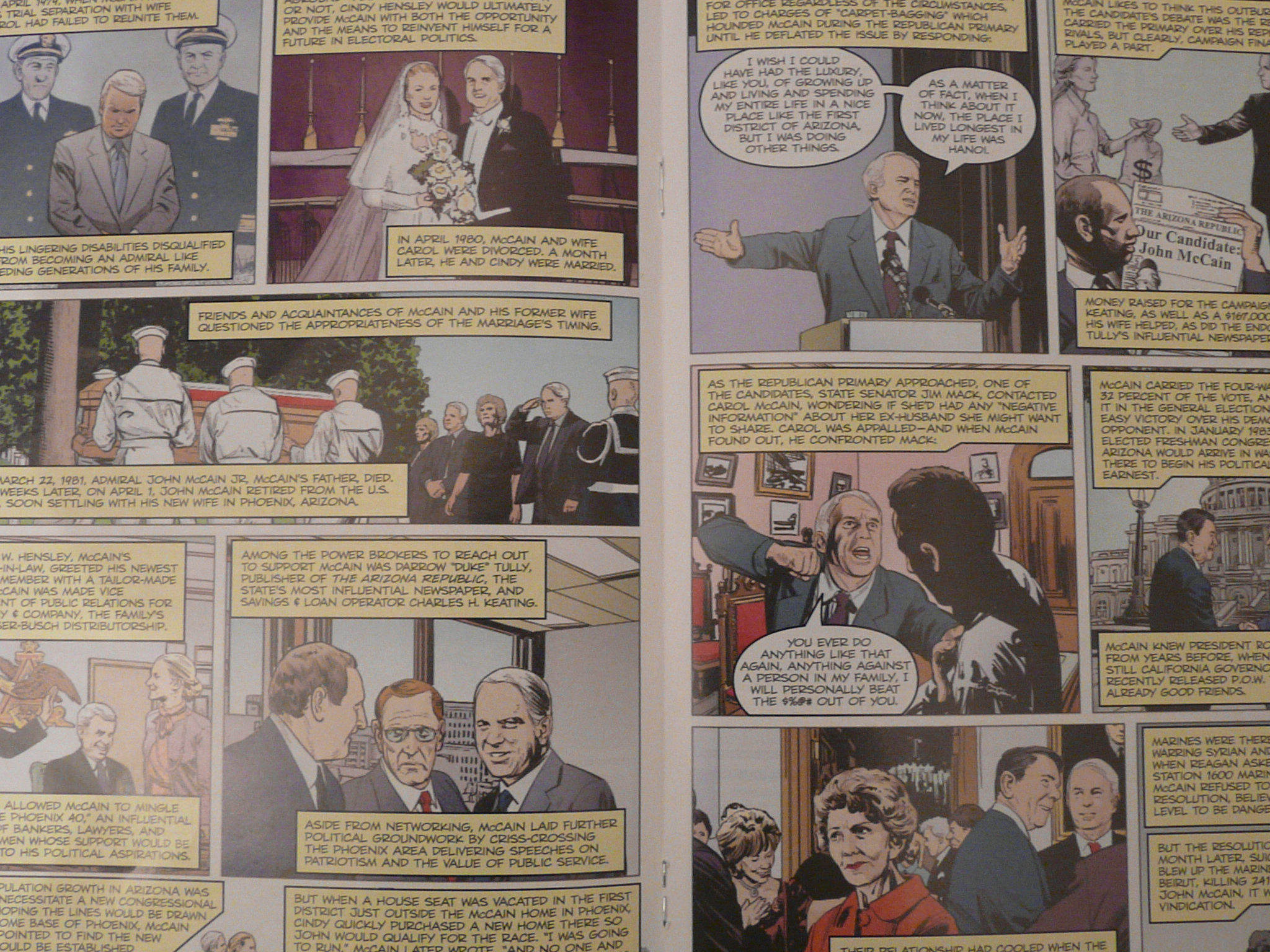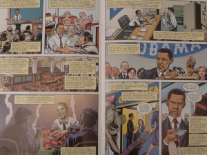 Ook mijn nieuwsgierigheid was gewekt en ik vond de stripboeken in een comic shop in New York. Hoewel beide kandidaten op de cover als onoverwinnelijke superhelden staan afgebeeld, lijkt de inhoud een ‘straight and unbiased look at the two presumptive party nominees’ te geven, zoals de uitgever belooft. De levensverhalen van de twee kandidaten en hun afgelegde weg naar het internationale politieke toneel wordt voorzien van commentaar en mooie tekeningen weergeven. De comic van Obama begint op super tuesday, maar blikt meteen daarna terug naar zijn kinderjaren op Hawaii. De comic over McCain begint in een cel in Hanoi, waar hij als POW gevangen zat tijdens de Vietnamoorlog.