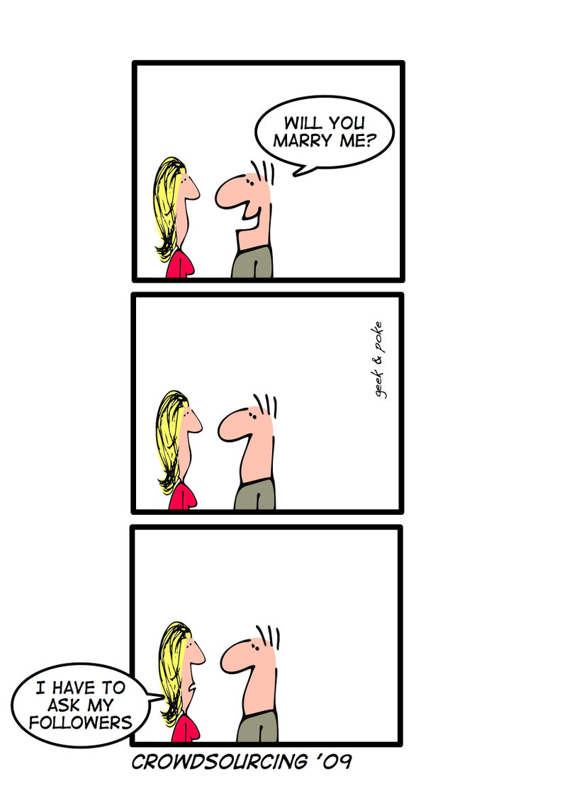 Twee weten meer dan één, dus laat vooral iedereen meepraten en bijdragen. De kracht van communities is het basisgegeven van crowdsourcing, de reden dat mensen voor allerhande kwesties hun Hyvesnetwerk of Twittervolgers inschakelen. Maar je kan het natuurlijk altijd overdrijven.