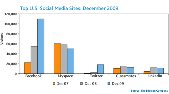 Social networking heeft in 2009 een vogelvlucht genomen: cijfers van Nielsen tonen aan dat gebruikers wereldwijd* 82% meer tijd aan social networks zijn gaan besteden. In december 2009 brachten consumenten gemiddeld 5,5 uur door op social network sites, wat een toename van 82% betekent ten opzichte van 2008. Facebook en Twitter hebben de grootste groei laten zien en zijn momenteel de voornaamste spelers op deze immer groeiende markt. Zo nam de gemiddeld doorgebrachte tijd op Facebook en Twitter in de V.S. toe met respectievelijk 200% en 368%.
