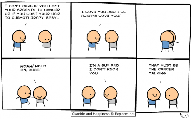 En wij maar denken dat Fokke en Sukke grofgebekt zijn. Het duo Cyanide & Happiness behandelt een nogal duister scala aan onderwerpen, onder meer verkrachting, handicaps, moord en necrofilie komen in de strip aan bod. En dus ook kanker. Communicatie is in ieder geval niet het sterkste punt van de twee, de boodschap komt vaker niet dan wel goed over.