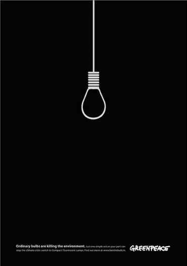 by Peter EversHoe staat het met uw gloeilampen? Zijn ze al weg? Of bent u er niet zo mee bezig? Hoewel de gloeilamp in Australië vanaf 1 januari 2010 verboden is lijkt de rest van de wereld ondanks de inspanningen van Al Gore en de zijnen weinig oog te hebben voor de spaarlamp. Om ons nog maar een beetje extra bewust te maken van de schadelijkheid van de gloeilamp kwam Greenpeace recentelijk met onderstaande advertentie. De status van de gloeilamp in al haar eenvoud vastgelegd.