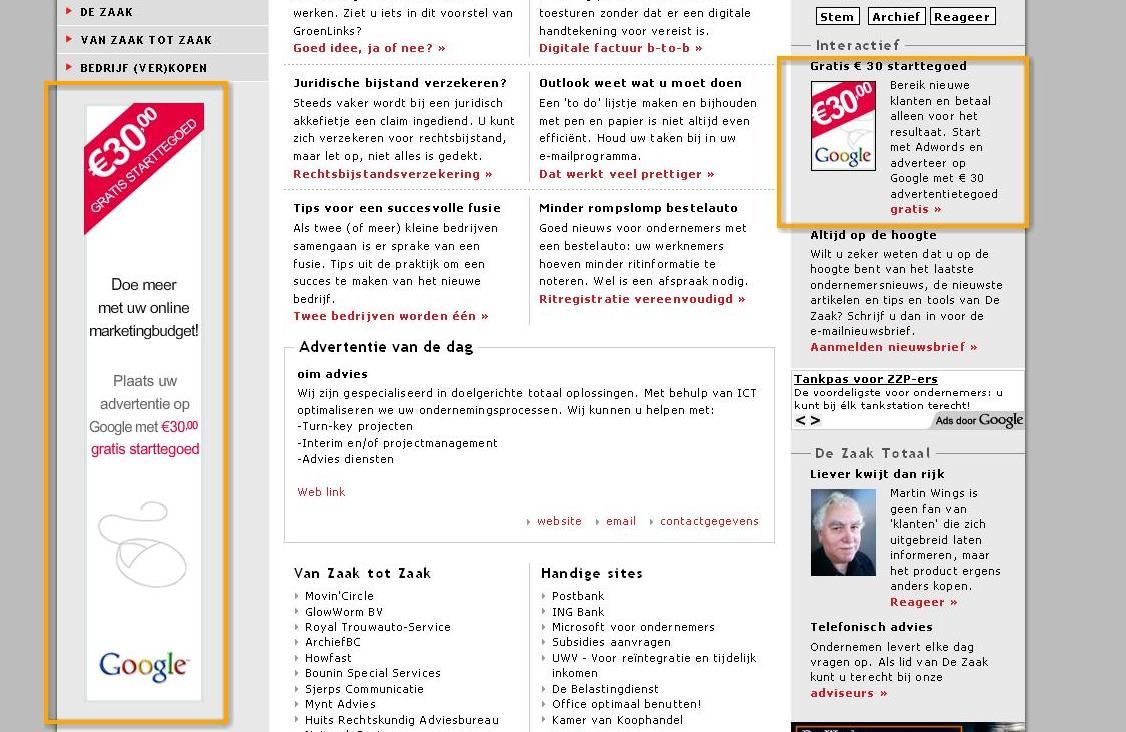 Google maakt reclame voor het eigen Adwords. Adverteren voor een adverteermodel dus, het moet niet veel gekker worden. Klikken leidt naar deze pagina: direct aanmelden en nog € 30,- starttegoed ook! Gelukkig komt Google overal mee weg, ook al krijgt het nu en dan nog wel wat kritiek te verwerken op de zoekmachinemarketing.
